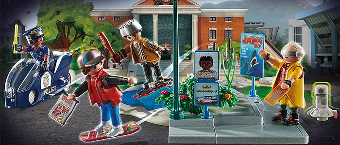 Playmobil is releasing two new Back to the Future playsets. There’s one inspired by the “future” of Back to the Future Part II with a playset inspired by the hoverboard chase in Hill Valley town square, and then we have a new vehicle playset inspired by the end of the original Back to the Future (which is also the beginning of the sequel), when a little change in history back in 1955 made Marty McFly’s present day life in 1985 a little bit sweeter. Check out the new Playmobil Back to the Future playsets below.