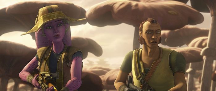 There’s no better situation to bring back Cut, his Twi’lek wife Suu (thankfully the animators grant her a less sexualized and a farm-appropriate outfit), and Suu’s two hybrid kids (Nika Futterman and Kath Soucie). Cut is a type of pariah like the Bad Batch, so it feels natural that Hunter and the Bad Batch alumni would feel acquainted with Cut, and Cut was the one who showed Rex that there were other states of beings outside being subservient clone soldiers. (Cut is aware of the “behavioral implant” by this time and his mind seems untouched, but why his biochip doesn’t affect him is not acknowledged, perhaps likely because he never received Palpatine’s Order 66 call.)