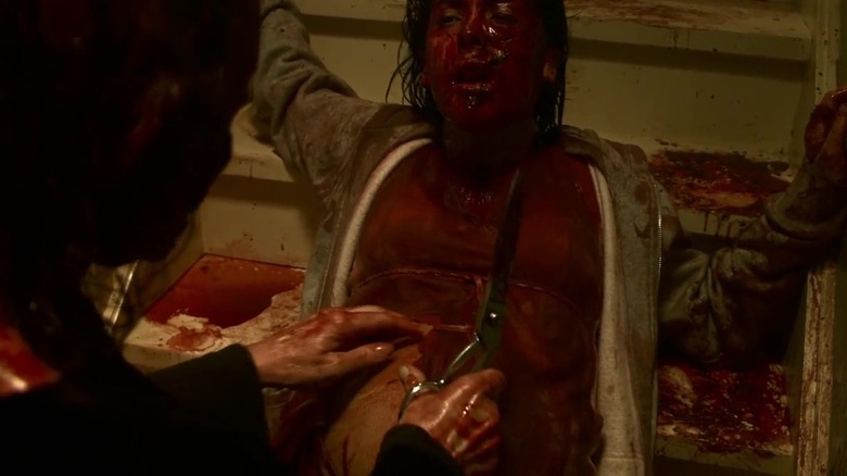 The most terrifying moment in "Inside" is a twisted act of kindness born from a nightmare. This obscenely violent French horror movie, part of the New French Extremity subgenre, finds Sarah, an overdue pregnant widow, stalked through her home by a mysterious woman wielding a very large, very sharp pair of scissors who wants one thing and one thing only: the unborn child in her victim's womb. Directors Julien Maury and Alexandre Bustillo lean on dread, ratcheting up the tension and allowing the spurts of brutal violence to emerge suddenly and painfully. You feel every cut in this movie. This is especially true in the climax, where Sarah, having suffered a terrible injury, goes into labor on the stairs. But the baby is stuck. So Sarah asks her tormenter to do exactly what she came here to do: remove the child with that giant pair of scissors.