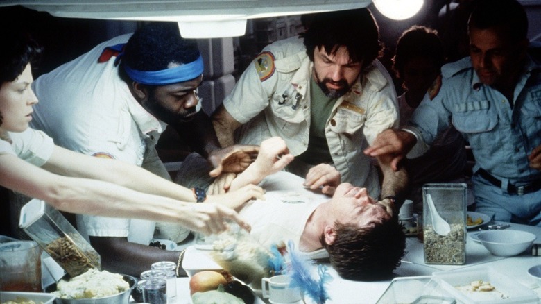 Kane's just spent an extended amount of time with a Facehugger tightly attached, and he regains consciousness with quite an appetite. The crew of the Nostromo settles around their vessel's dinner table, passing rehydrated dishes. Kane chows on a few mouthfuls but then starts acting like he's choking or consumed poison. Crewmates gaze on in horror as Kane starts convulsing atop their feast, with everyone begging Kane to describe his internal pain. Then, a burst of red mist stains his white uniform shirt after a tear-pop explosion sound effect. A few more writhes and the incubated Xenomorph baby growing inside Kane jack-in-the-boxes out of his body, slick with warm human blood. The infantile alien glances around at stunned and mortified crewmember faces, equally horrified as the viewers watching in theaters or from the now tainted comforts of home. (Matt Donato)