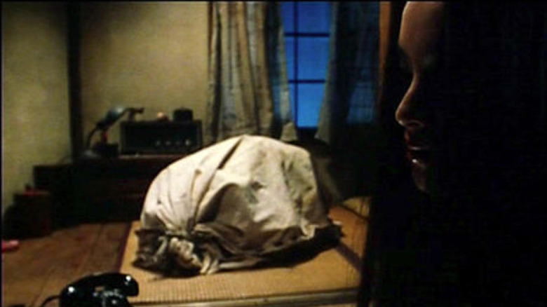 The moment is simple: a man, Aoyama, struggles to decide whether or not he should call a woman back. After a few rings, it's revealed that her apartment is bare except for a phone and a massive sack. The young woman, Asami, has been waiting four days for his call. Her creeping grin heightens the dread, but it kicks into full gear just seconds later, when the bag suddenly lurches towards the edge of the frame and it's apparent that Asami has been keeping something big and alive in the bag — and it only gets freakier when the contents are revealed.