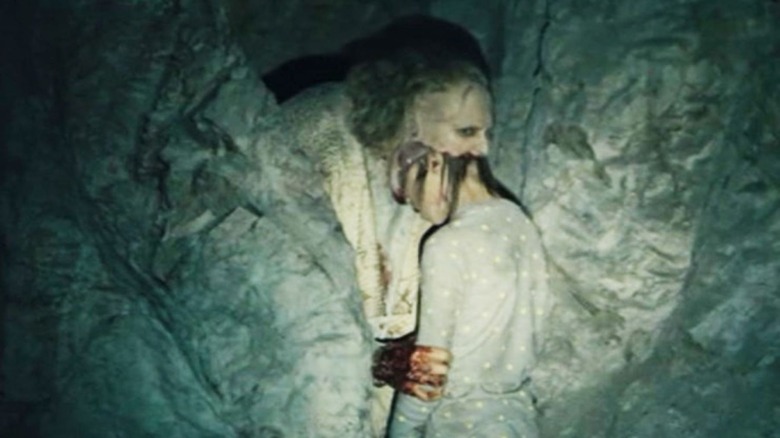 It all culminates with Deborah absconding with a young girl to a dark cave to complete the ritual, camera crew in hot pursuit. As the camera and its dim lights desperately search the cavern, the image pans over to reveal ... Deborah, her jaw unhinged like a snake, her mouth unnaturally wrapped about the entire head of her young victim, prepared to devour her whole. The handheld camera and the lack of a score lend an upsetting reality to image that simply should not be, especially since director Adam Robitel wisely waits until late in the film to take things to this extreme. It's an image so shocking, it's become a common gif shared in horror circles. The greatest testament to its success is that it's just as terrifying in context. (Jacob Hall)