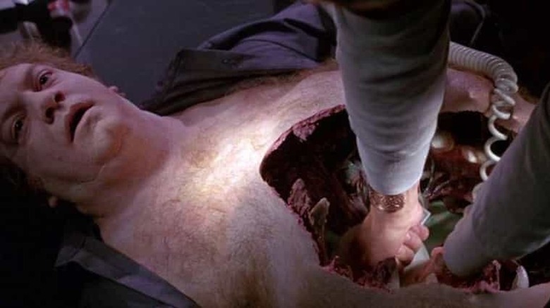 "The Thing" is the granddaddy of body horror movies, as an unfortunate group of Antarctic researchers is picked off one by one by an alien entity that infiltrates their bodies and twists them in gruesome ways. After Norris (Charles Hallahan) suffers a heart attack, the resident doctor attempts to save his life using a defibrillator. But when he goes to press the pads to Norris' chest, it opens up into a fanged mouth that closes around the doctor's arms and bites them off!